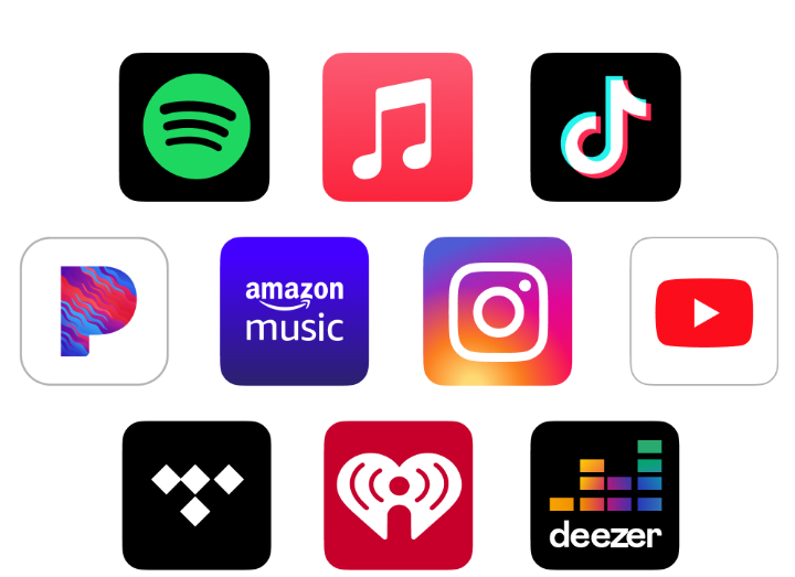 Distribuimos tu música a Spotify, Apple Music, TikTok, Pandora, Amazon, Instagram, YouTube, Tidal, iHeartRadio, Deezer y muchas más tiendas y servicios de streaming.